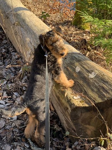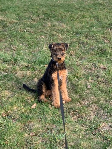 "Grisu macht sich sehr gut und fühlt sich anscheinend auch wohl. Eine Airedale-Dame aus der weiteren Familie hilft bei der Eingewöhnung..."