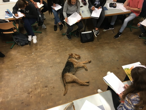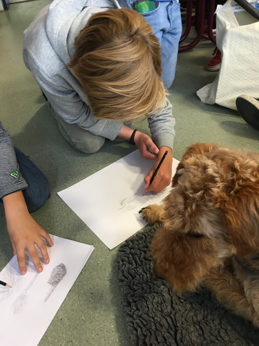 "... 4 Klassen üben naturalistische Zeichnungen ... und was soll ich sagen, die Bilder unten sprechen eine eindeutige Sprache, ... einen so gechillten Hund hatte ich noch nie. Natürlich folgt die Bezahlung in Form von Leckerlies auf dem Fuß ..."