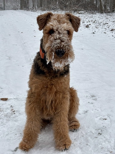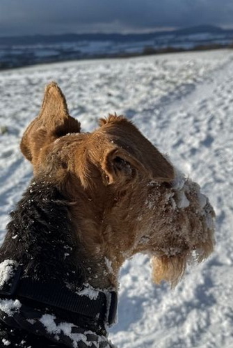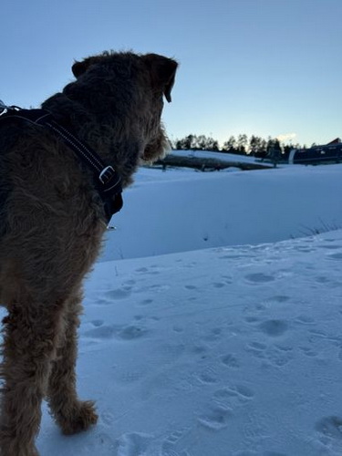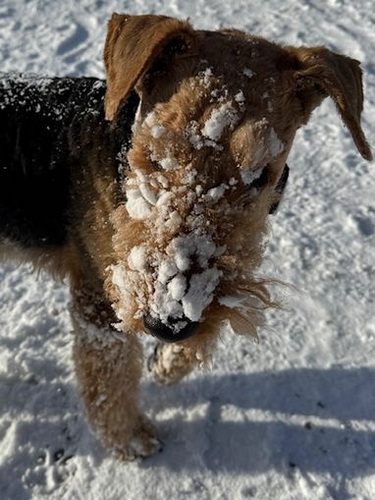 "Theo liebt den Schnee und die Hinterbeine überholen ihn beim Toben durch die weiße Landschaft..."