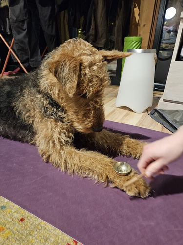 Lila (Dark Rose) hilft - beim Yoga, bei den Klangschalen, beim Putzen