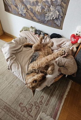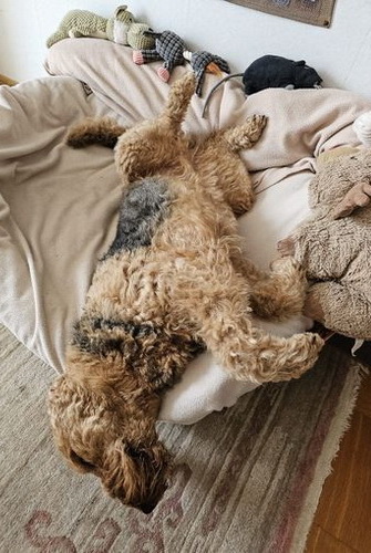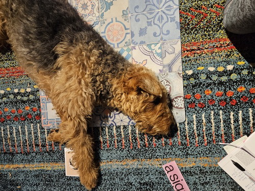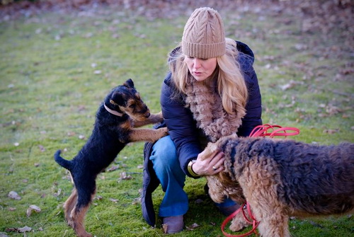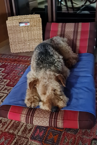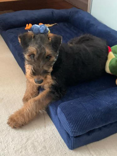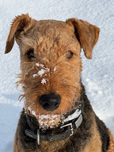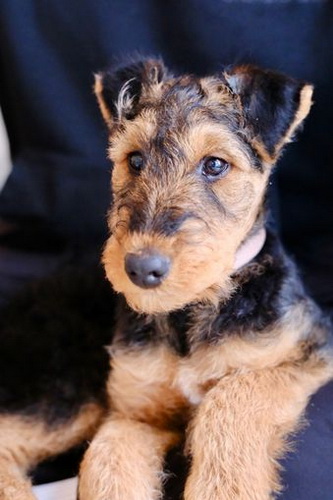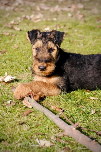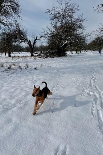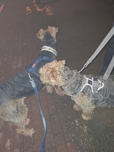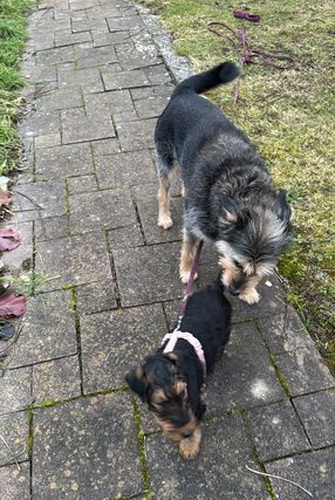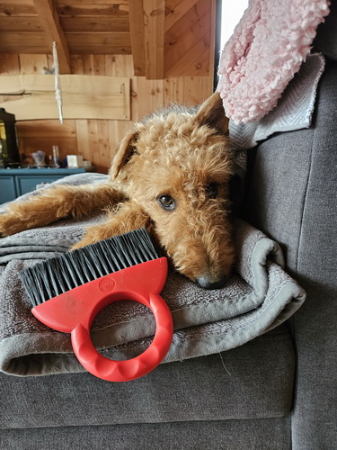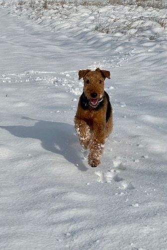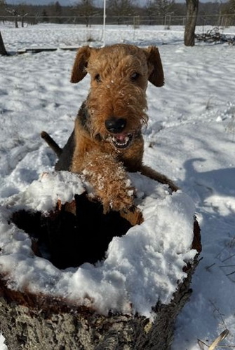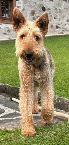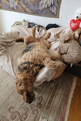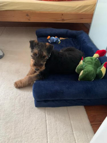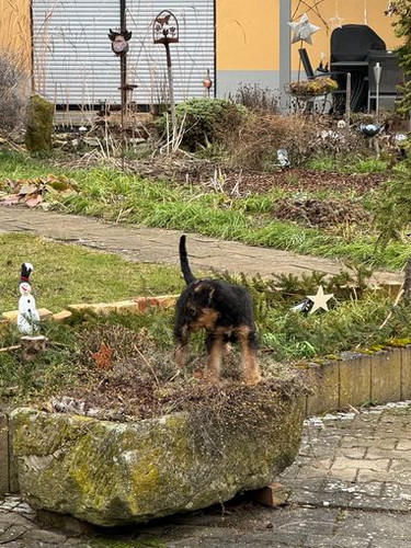 "Grisu macht sich sehr gut und fühlt sich anscheinend auch wohl. Eine Airedale-Dame aus der weiteren Familie hilft bei der Eingewöhnung..."