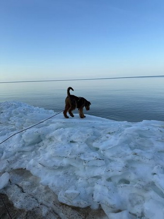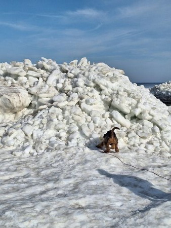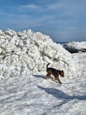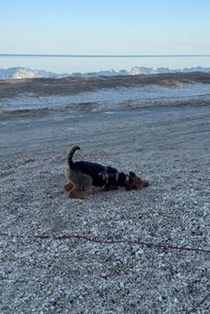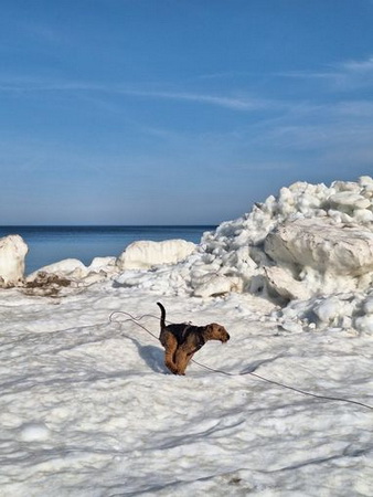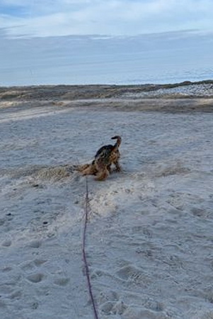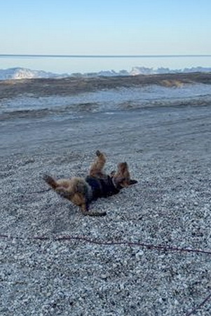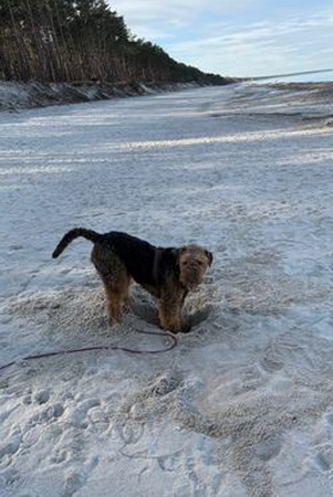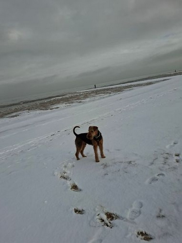 "Ich bin heute mal mit meinem Personal in Urlaub nach Cuxhaven gefahren - die beiden brauchen mal Urlaub und ich gönne es ihnen. Natürlich muß ich mit und alles überwachen. Hier hat es geschneit und es ist seeehr windig, meine Ohren stehen ständig auf Sturm. Trotzdem tobe ich mich so richtig am Strand aus und genieße das Laufen im Sand..."