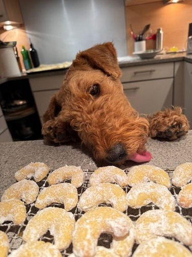 "... Hundeschule wird streberhaft absolviert, zu Hause der Hooligan rausgehängt. Die ersten Ferien an Nord- und Ostsee mit dem Camper kennengelernt, das Meer gejagt und den Sand geschmeckt, Hundekumpels beim Dogsitter bespielt, und weitläufige Ausflüge mit großen und kleinen Spaß- und "Jagd"einlagen gehören zum Alltag... Aus einem lange "Versteckt im Garten-Pinkler" ist ein "selbstsicher alle Wege markierender-Teenie" geworden. Auch die ersten Beeren im Garten werden geerntet, und sowieso ist Fjellis überall vorne dabei und hat Vögel, Igel und das Personal (meist) unter Kontrolle und will sich gezielt zur Airedale-Königin etwablieren..."